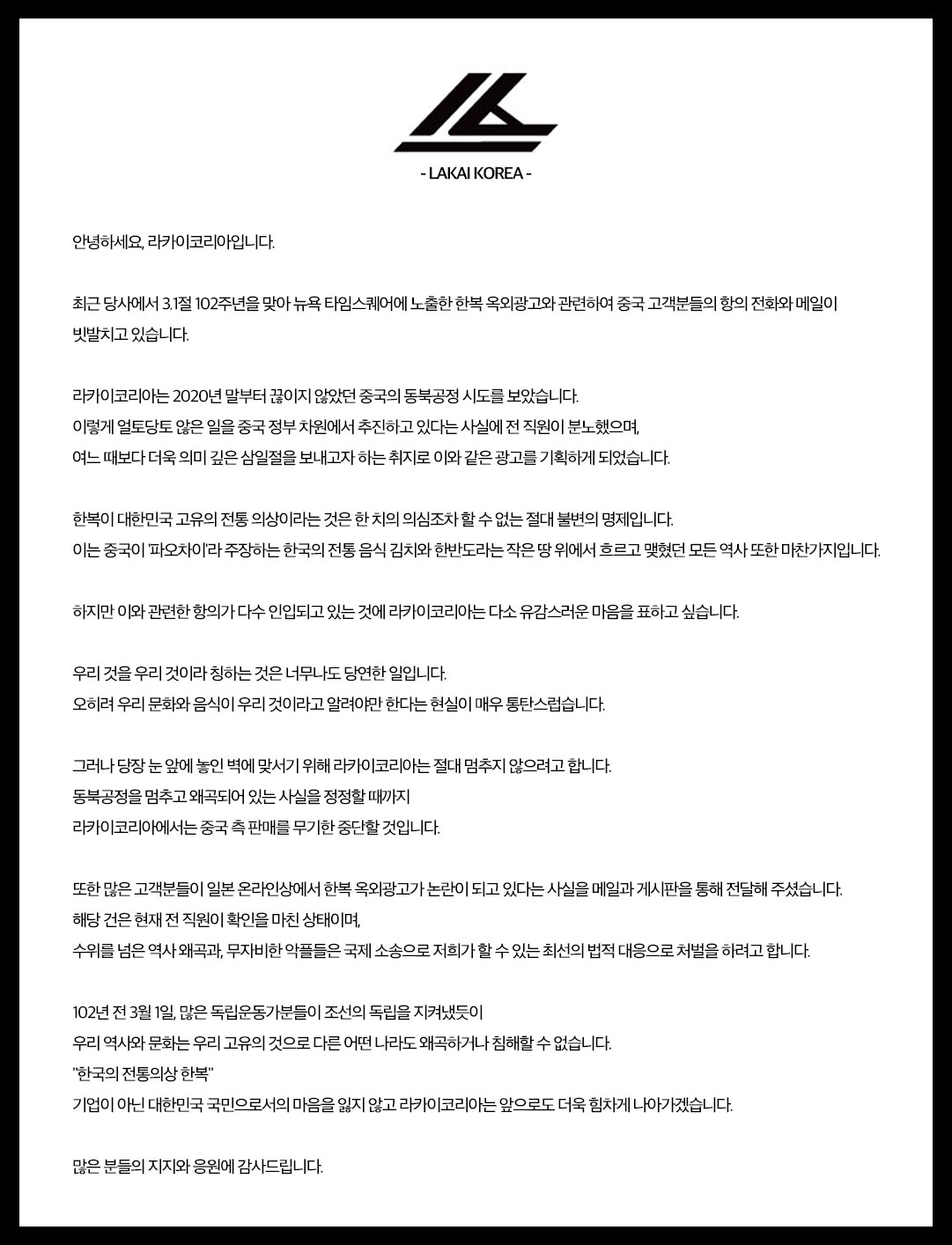 라카이코리아에서는 이 한복 옥외 광고가 걸리고 나서 중국 고객들의 항의 전화와 메일이 빗발치고 있다며 다음과 같은 성명문을 발표하였습니다.